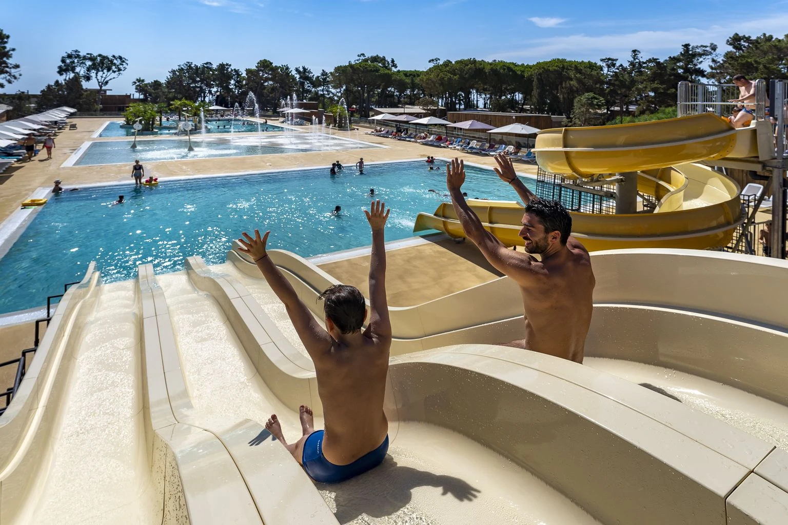 - Schwimmbad mit Springbrunnenbecken und Rutschen